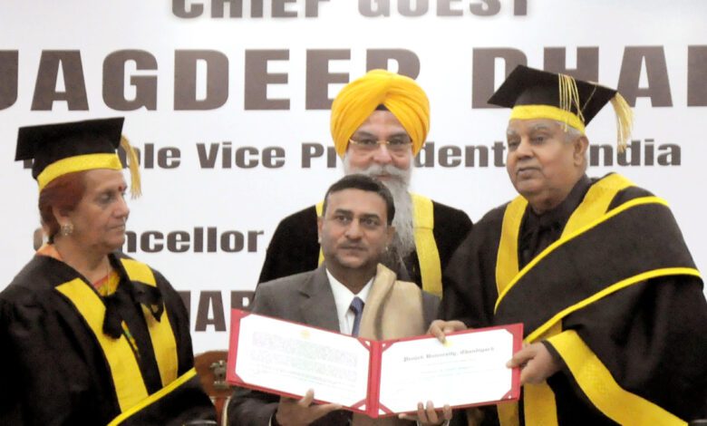 ਚੰਡੀਗੜ੍ਹ (ਪੰਜਾਬੀ ਅਖ਼ਬਾਰ ਬਿਊਰੋ)ਪੰਜਾਬ ਯੂਨੀਵਰਸਿਟੀ ਚੰਡੀਗੜ੍ਹ ਵਲੋਂ ਆਪਣੀ 71-ਵੀ ਕਨਵੋਕੇਸ਼ਨ ਮੌਕੇ 48 ਸਾਲ ਦੀ ਉਮਰ ਵਿਚ 68 ਕਿਤਾਬਾਂ ਦੇ ਲੇਖਕ ਨਿੰਦਰ ਘੁਗਿਆਣਵੀ ਨੂੰ ‘ਸਾਹਿਤ ਰਤਨ’ ਉਪ ਰਾਸ਼ਟਰਪਤੀ ਤੇ ਯੂਨੀਵਰਸਟੀ ਦੇ ਚਾਂਸਲਰ ਸ਼੍ਰੀ ਜਗਦੀਪ ਧਨਖੜ ਵੱਲੋਂ ਪ੍ਰਦਾਨ ਕੀਤਾ ਗਿਆ। ਮਹਾਂਰਾਸ਼ਟਰ ਦੀ ਮਹਾਤਮਾ ਗਾਂਧੀ ਅੰਤਰਰਾਸ਼ਟਰੀ ਹਿੰਦੀ ਯੂਨੀਵਰਸਿਟੀ ਵਰਧਾ ਵਿਖੇ ਰਾਈਟਰ ਇਨ ਰੈਜੀਡੈਂਟ ਨਿਯੁਕਤ ਹੋਣ ਵਾਲੇ ਨਿੰਦਰ ਘੁਗਿਆਣਵੀ ਸਿਰਫ 9 ਜਮਾਤਾਂ ਪਾਸ ਘੁਗਿਆਣਵੀ ਦੀ ਲਿਖੀਆਂ ਪੁਸਤਕਾਂ ਉਤੇ ਲਗਪਗ 12 ਵਿਦਿਆਰਥੀ ਐਮ ਫਿਲ ਤੇ ਪਈ ਐਚ ਡੀ ਕਰ ਚੁਕੇ ਹਨ। ਵਾਈਸ ਚਾਂਸਲਰ ਡਾ ਰੇਣੂ ਵਿੱਗ ਨੇ ਘੁਗਿਆਣਵੀ ਦਾ ਸਨਮਾਨ ਪੱਤਰ ਪੜਦਿਆਂ ਸਾਹਿਤਕ ਪ੍ਰਾਪਤੀਆਂ ਬਾਰੇ ਚਾਨਣਾ ਪਾਇਆ। ਐਵਾਰਡ ਭੇਟ ਕਰਨ ਮੌਕੇ ਉਪ ਰਾਸ਼ਟਰਪਤੀ ਨੇ ਨਿੰਦਰ ਜੀ ਦੀ ਹੌਸਲਾ ਅਫਜ਼ਾਈ ਕਰਦਿਆਂ ਕਿਹਾ ਕਿ ਉਨਾਂ ਨੂੰ ਉਨਾਂ ਦੀਆਂ ਲਿਖਤਾਂ ਤੇ ਜੀਵਨ ਸੰਘਰਸ਼ ਬਾਰੇ ਜਾਣ ਕੇ ਖੁਸ਼ੀ ਹੋਈ ਹੈ। ਇਸ ਮੌਕੇ ਹਾਜਰ ਪੰਜਾਬ ਵਿਧਾਨ ਸਭਾ ਦੇ ਸਪੀਕਰ ਕੁਲਤਾਰ ਸਿੰਘ ਸੰਧਵਾਂ ਨੇ ਉਪ ਰਾਸ਼ਟਰਪਤੀ ਨੂੰ ਦੱਸਿਆ ਕਿ ਨਿੰਦਰ ਘੁਗਿਆਣਵੀ ਦੁਆਰਾ ਰਚਿਤ ਕਿਤਾਬ ‘ਮੈਂ ਸਾਂ ਜੱਜ ਦਾ ਅਰਦਲੀ’ ਦੇ ਮਨ ਪਸੰਦ ਕਿਤਾਬ ਹੈ। ਇਸ ਮੌਕੇ ਉਤੇ ਪੰਜਾਹ ਦੇ ਗਵਰਨਰ ਬਨਵਾਰੀ ਲਾਲ ਪੁਰੋਹਿਤ, ਹਰਿਆਣਾ ਦੇ ਗਵਰਨਰ ਬੰਡਾਰੂ ਦੱਤਾ ਤਰੇ, ਸਿੱਖਿਆ ਮੰਤਰੀ ਹਰਜੋਤ ਸਿੰਘ ਬੈਂਸ ਤੇ ਹੋਰ ਉਘੀਆਂ ਹਸਤੀਆਂ ਮੌਜੂਦ ਸਨ।