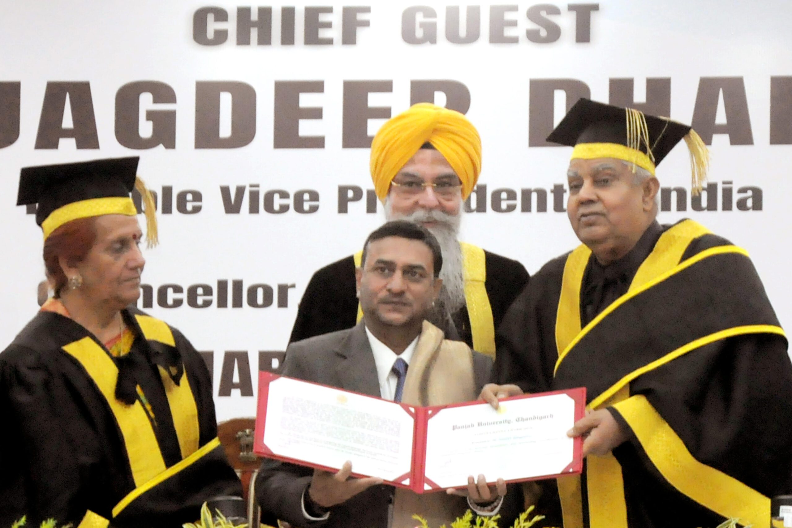 ਚੰਡੀਗੜ੍ਹ (ਪੰਜਾਬੀ ਅਖ਼ਬਾਰ ਬਿਊਰੋ)ਪੰਜਾਬ ਯੂਨੀਵਰਸਿਟੀ ਚੰਡੀਗੜ੍ਹ ਵਲੋਂ ਆਪਣੀ 71-ਵੀ ਕਨਵੋਕੇਸ਼ਨ ਮੌਕੇ 48 ਸਾਲ ਦੀ ਉਮਰ ਵਿਚ 68 ਕਿਤਾਬਾਂ ਦੇ ਲੇਖਕ ਨਿੰਦਰ ਘੁਗਿਆਣਵੀ ਨੂੰ ‘ਸਾਹਿਤ ਰਤਨ’ ਉਪ ਰਾਸ਼ਟਰਪਤੀ ਤੇ ਯੂਨੀਵਰਸਟੀ ਦੇ ਚਾਂਸਲਰ ਸ਼੍ਰੀ ਜਗਦੀਪ ਧਨਖੜ ਵੱਲੋਂ ਪ੍ਰਦਾਨ ਕੀਤਾ ਗਿਆ। ਮਹਾਂਰਾਸ਼ਟਰ ਦੀ ਮਹਾਤਮਾ ਗਾਂਧੀ ਅੰਤਰਰਾਸ਼ਟਰੀ ਹਿੰਦੀ ਯੂਨੀਵਰਸਿਟੀ ਵਰਧਾ ਵਿਖੇ ਰਾਈਟਰ ਇਨ ਰੈਜੀਡੈਂਟ ਨਿਯੁਕਤ ਹੋਣ ਵਾਲੇ ਨਿੰਦਰ ਘੁਗਿਆਣਵੀ ਸਿਰਫ 9 ਜਮਾਤਾਂ ਪਾਸ ਘੁਗਿਆਣਵੀ ਦੀ ਲਿਖੀਆਂ ਪੁਸਤਕਾਂ ਉਤੇ ਲਗਪਗ 12 ਵਿਦਿਆਰਥੀ ਐਮ ਫਿਲ ਤੇ ਪਈ ਐਚ ਡੀ ਕਰ ਚੁਕੇ ਹਨ। ਵਾਈਸ ਚਾਂਸਲਰ ਡਾ ਰੇਣੂ ਵਿੱਗ ਨੇ ਘੁਗਿਆਣਵੀ ਦਾ ਸਨਮਾਨ ਪੱਤਰ ਪੜਦਿਆਂ ਸਾਹਿਤਕ ਪ੍ਰਾਪਤੀਆਂ ਬਾਰੇ ਚਾਨਣਾ ਪਾਇਆ। ਐਵਾਰਡ ਭੇਟ ਕਰਨ ਮੌਕੇ ਉਪ ਰਾਸ਼ਟਰਪਤੀ ਨੇ ਨਿੰਦਰ ਜੀ ਦੀ ਹੌਸਲਾ ਅਫਜ਼ਾਈ ਕਰਦਿਆਂ ਕਿਹਾ ਕਿ ਉਨਾਂ ਨੂੰ ਉਨਾਂ ਦੀਆਂ ਲਿਖਤਾਂ ਤੇ ਜੀਵਨ ਸੰਘਰਸ਼ ਬਾਰੇ ਜਾਣ ਕੇ ਖੁਸ਼ੀ ਹੋਈ ਹੈ। ਇਸ ਮੌਕੇ ਹਾਜਰ ਪੰਜਾਬ ਵਿਧਾਨ ਸਭਾ ਦੇ ਸਪੀਕਰ ਕੁਲਤਾਰ ਸਿੰਘ ਸੰਧਵਾਂ ਨੇ ਉਪ ਰਾਸ਼ਟਰਪਤੀ ਨੂੰ ਦੱਸਿਆ ਕਿ ਨਿੰਦਰ ਘੁਗਿਆਣਵੀ ਦੁਆਰਾ ਰਚਿਤ ਕਿਤਾਬ ‘ਮੈਂ ਸਾਂ ਜੱਜ ਦਾ ਅਰਦਲੀ’ ਦੇ ਮਨ ਪਸੰਦ ਕਿਤਾਬ ਹੈ। ਇਸ ਮੌਕੇ ਉਤੇ ਪੰਜਾਹ ਦੇ ਗਵਰਨਰ ਬਨਵਾਰੀ ਲਾਲ ਪੁਰੋਹਿਤ, ਹਰਿਆਣਾ ਦੇ ਗਵਰਨਰ ਬੰਡਾਰੂ ਦੱਤਾ ਤਰੇ, ਸਿੱਖਿਆ ਮੰਤਰੀ ਹਰਜੋਤ ਸਿੰਘ ਬੈਂਸ ਤੇ ਹੋਰ ਉਘੀਆਂ ਹਸਤੀਆਂ ਮੌਜੂਦ ਸਨ।