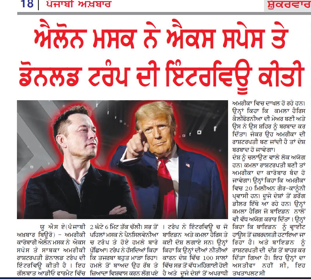 ਯੂ ਐਸ ਏ(ਪੰਜਾਬੀ ਅਖ਼ਬਾਰ ਬਿਊਰੋ) ਅਮਰੀਕੀ ਕਾਰੋਬਾਰੀ ਐਲੋਨ ਮਸਕ ਨੇ ਐਕਸ ਸਪੇਸ ‘ਤੇ ਸਾਬਕਾ ਅਮਰੀਕੀ ਰਾਸ਼ਟਰਪਤੀ ਡੋਨਾਲਡ ਟਰੰਪ ਦੀ ਇੰਟਰਵਿਊ ਕੀਤੀ ਹੈ । ਇਹ ਗੱਲਬਾਤ ਆਡੀਓ ਫਾਰਮੈਟ ਵਿੱਚ 2 ਘੰਟੇ 6 ਮਿੰਟ ਤੱਕ ਚੱਲੀ। ਸਭ ਤੋਂ ਪਹਿਲਾਂ ਮਸਕ ਨੇ ਪੈਨਸਿਲਵੇਨੀਆ ‘ਚ ਟਰੰਪ ‘ਤੇ ਹੋਏ ਹਮਲੇ ਬਾਰੇ ਪੁੱਛਿਆ। ਟਰੰਪ ਨੇ ਹੱਸਦਿਆਂ ਕਿਹਾ ਕਿ ਤਜਰਬਾ ਬਹੁਤ ਮਾੜਾ ਰਿਹਾ। ਹਮਲੇ ਤੋਂ ਬਾਅਦ ਉਹ ਰੱਬ ‘ਤੇ ਜ਼ਿਆਦਾ ਵਿਸ਼ਵਾਸ ਕਰਨ ਲੱਗ ਪਏ । ਟਰੰਪ ਨੇ ਇੰਟਰਵਿਊ ‘ਚ ਜੋ ਬਾਇਡਨ ਅਤੇ ਕਮਲਾ ਹੈਰਿਸ ‘ਤੇ ਕਈ ਦੋਸ਼ ਲਗਾਏ ਸਨ। ਉਨ੍ਹਾਂ ਕਿਹਾ ਕਿ ਉਨ੍ਹਾਂ ਦੀਆਂ ਨੀਤੀਆਂ ਕਾਰਨ ਦੇਸ਼ ਵਿੱਚ 100 ਸਾਲਾਂ ਵਿੱਚ ਸਭ ਤੋਂ ਵੱਧ ਮਹਿੰਗਾਈ ਹੋਈ ਹੈ ਅਤੇ ਦੂਜੇ ਦੇਸ਼ਾਂ ਤੋਂ ਅਪਰਾਧੀ ਅਮਰੀਕਾ ਵਿਚ ਦਾਖਲ ਹੋ ਰਹੇ ਹਨ। ਉਨ੍ਹਾਂ ਕਿਹਾ ਕਿ ਕਮਲਾ ਹੈਰਿਸ ਕੈਲੀਫੋਰਨੀਆ ਦੀ ਮੇਅਰ ਬਣੀ ਅਤੇ ਉਸ ਨੇ ਉਸ ਸ਼ਹਿਰ ਨੂੰ ਬਰਬਾਦ ਕਰ ਦਿੱਤਾ। ਜੇਕਰ ਉਹ ਅਮਰੀਕਾ ਦੀ ਰਾਸ਼ਟਰਪਤੀ ਬਣ ਜਾਂਦੀ ਹੈ ਤਾਂ ਦੇਸ਼ ਬਰਬਾਦ ਹੋ ਜਾਵੇਗਾ।