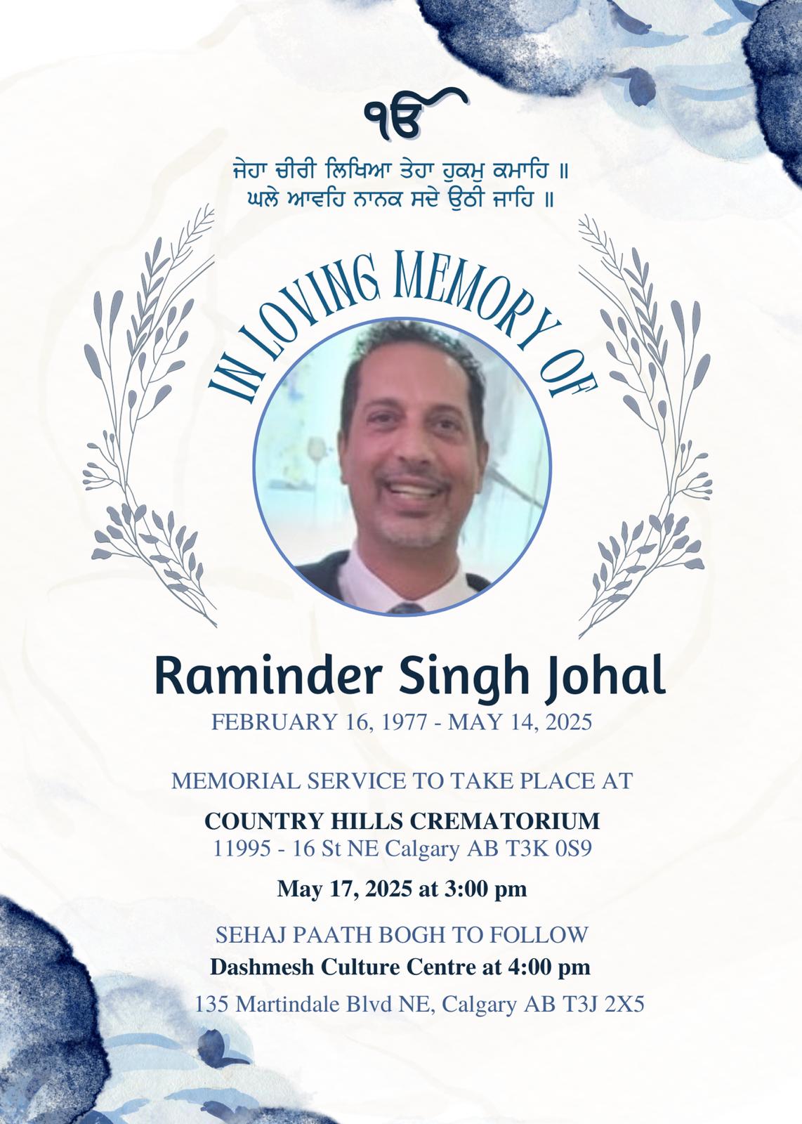 ਉਮਰ ਹਾਲੇ 48 ਸਾਲ, ਯਾਰ ਇਹ ਕੋਈ ਜਾਣ ਦੀ ਉਮਰ ਥੋੜਾ ਹੁੰਦੀ ਐ । ਪੁੱਤਰ ਦੀ ਅਰਥੀ ਨੂੰ ਮੋਢਾ ਦੇਣਾ, ਬਜੁਰਗ ਮਾਪਿਆਂ ਲਈ ਇਹ ਬਹੁਤ ਔਖਾ ਐ । ਦੋ ਧੀਆਂ ਦੇ ਸਿਰ ਉੱਪਰ ਪਿਤਾ ਦਾ ਸਹਾਰਾ ਨਾ ਰਹਿਣਾ ਅਤੇ ਕਿਸੇ ਪਤਨੀ ਦਾ ਇਸ ਉਮਰੇ ਵਿਧਾਵਾ ਹੋ ਜਾਣਾ ਬਹੁਤ ਦੁਖਦਾਈ ਐ। ਰਮਿੰਦਰ ਸਿੰਘ ਜੌਹਲ ਦੇ ਇਸ ਉਮਰੇ ਇਸ ਜਹਾਨੋ ਤੁਰ ਜਾਣ ਬਾਰੇ ਦੂਖਦਾਈ ਖ਼ਬਰ ਨੇ ਸਾਡੇ ਸਾਰਿਆਂ ਦੇ ਹਿਰਦੇ ਨੂੰ ਕਦੀ ਨਾ ਭੁਲਾਏ ਜਾ ਸਕਣ ਵਾਲੇ ਜਖਮ ਦਿੱਤੇ। ਗੁਰਦਾਸਪੁਰ ਜਿਲੇ ਦੇ ਪਿੰਡ ਪਸਨਾਵਾਲ ਵਿਖੇ ਜਨਮਿਆ ਰਮਿੰਦਰ ਜੌਹਲ, ਧਾਰੀਵਾਲ ਤੋਂ 12ਵੀਂ ਕਰਦਿਆਂ ਸਰਕਾਰੀ ਕਾਲਿਜ ਗੁਰਦਾਸਪੁਰ ਤੋਂ ਗਰੈਜੂਏਟ ਹੋਇਆ। ਪੰਜਾਬ ਯੂਨੀਵਰਿਸਟੀ ਤੋਂ ਐਮ ਏ ਕੀਤੀ ।ਕਨੇਡਾ ਆਕੇ ਟਰੱਕਿੰਗ ਇੰਡਸਟਰੀ ਵਿੱਚ ਕੰਮ ਕਰਦਿਆਂ ਆਪਣਾ ਆਲਾ ਦੁਆਲਾ ਮਿੱਤਰਤਾਈ ਦੇ ਫੁੱਲਾਂ ਨਾਲ ਮਹਿਕਾਉਣਾ ਰਮਿੰਦਰ ਜੌਹਲ ਦੇ ਹਿੱਸੇ ਆਇਆ ਸੀ। ਪਰ 14 ਮਈ 2025 ਦੀ ਕਾਲੀ ਸਵੇਰ ਨੂੰ ਮੌਤ ਰੂਪੀ ਹਨੇਰੀ ਤੈਨੂੰ ਸਾਡੇ ਨਾਲੋਂ ਵਿਛੋੜ ਕੇ ਲੈ ਗਈ। 17 ਮਈ 2025 ਨੂੰ ਕੰਟਰੀਹਿੱਲਜ ਵਾਲੇ ਫਿਊਨਰਲ ਹੋਮ ਵਿਖੇ ਸਵ: ਰਮਿੰਦਰ ਸਿੰਘ ਜੌਹਲ ਦੀ ਮ੍ਰਿਤਕ ਦੇਹ ਦਾ ਅੰਤਿਮ ਸਸਕਾਰ ਸਾਮੀ ਤਿੰਨ ਵਜੇ ਹੋਵੇਗਾ । ਸਸਕਾਰ ਉਪਰੰਤ ਅੰਤਿਮ ਅਰਦਾਸ ਗੁਰੂਦਵਾਰਾ ਦਸਮੇਸ਼ ਕਲਚਰਲ ਸੈਂਟਰ ਕੈਲਗਰੀ ਵਿਖੇ ਹੋਵੇਗੀ।
