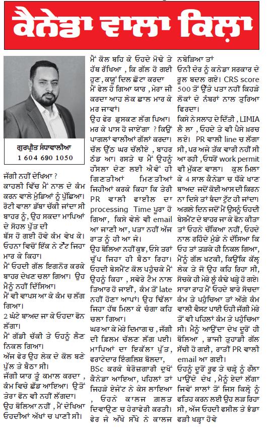 ਘਰ ਆ ਕੇ ਮੇਰੇ ਦਿਮਾਗ ਚ , ਜੱਗੀ ਦੀ ਫ਼ਿਲਮ ਚੱਲਣ ਲੱਗ ਪਈ। ਮਾਪਿਆਂ ਦਾ ਇਕੱਲਾ ਪੁੱਤ, ਫਰਾਟੇਦਾਰ ਇੰਗਲਿਸ਼ ਬੋਲਦਾ, BSc ਕਰਕੇ ਬੇਰੋਜ਼ਗਾਰੀ ਦੁਖੋਂ ਕੈਨੇਡਾ ਆਇਆ, ਪਹਿਲਾਂ ਤਾਂ ਜਿਹੜੇ ਏਜੇਂਟ ਨੇ ਕੇਸ ਲਾਇਆ , ਓਹਨੇ ਕਾਲਜ ਗ਼ਲਤ ਦਿਵਾਉਣ ‘ਚ ਹੇਰਾਫੇਰੀ ਕਰਤੀ। ਫੇਰ ਜੇ ਔਖੇ ਸੌਖੇ ਨੇ ਕਾਲਜ ਨਬੇੜਿਆ ਤਾਂ ਓਨੀ ਦੇਰ ਨੂੰ ਕਨੇਡਾ ਸਰਕਾਰ ਦੇ ਰੂਲ ਬਦਲ ਗਏ। CRS score 500 ਤੋਂ ਉੱਤੇ ਪਤਾ ਨਹੀਂ ਕਿਹੜੇ ਲੋਕਾਂ ਦੇ ਨੰਬਰਾਂ ਨਾਲ ਤੁਰਿਆ ਫਿਰਦਾ।