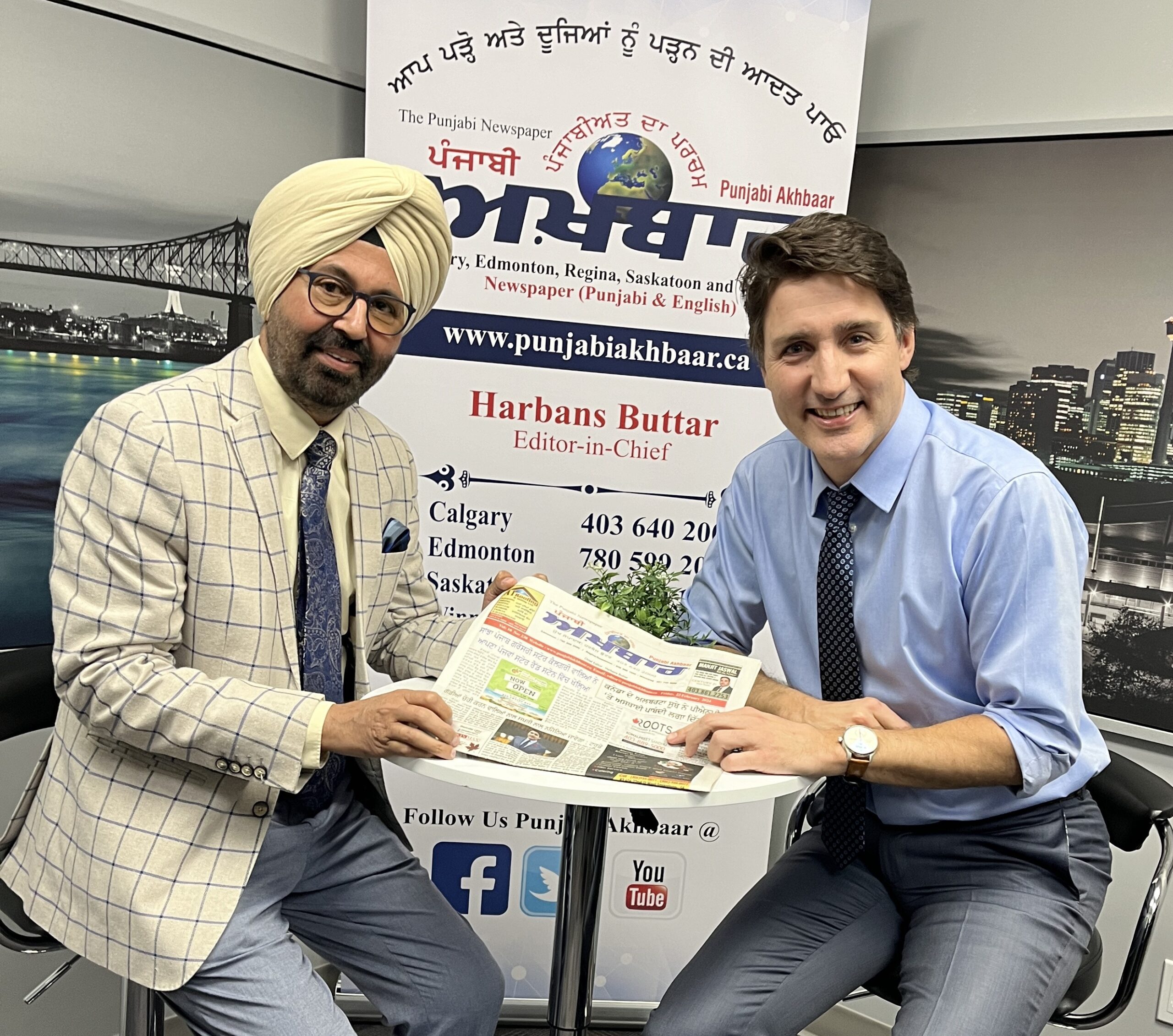 ਕੈਲਗਰੀ ਸਟੂਡਿਓ ਵਿੱਚ ਪੰਜਾਬੀ ਅਖ਼ਬਾਰ ਦੇ ਮੁੱਖ ਸੰਪਾਦਕ ਹਰਬੰਸ ਬੁੱਟਰ ਅਤੇ ਮਾਨਯੋਗ ਕਨੇਡੀਅਨ ਪ੍ਰਧਾਨ ਮੰਤਰੀ ਜਸਟਿਨ ਟਰੂਡੋ ਸਾਹਿਬ