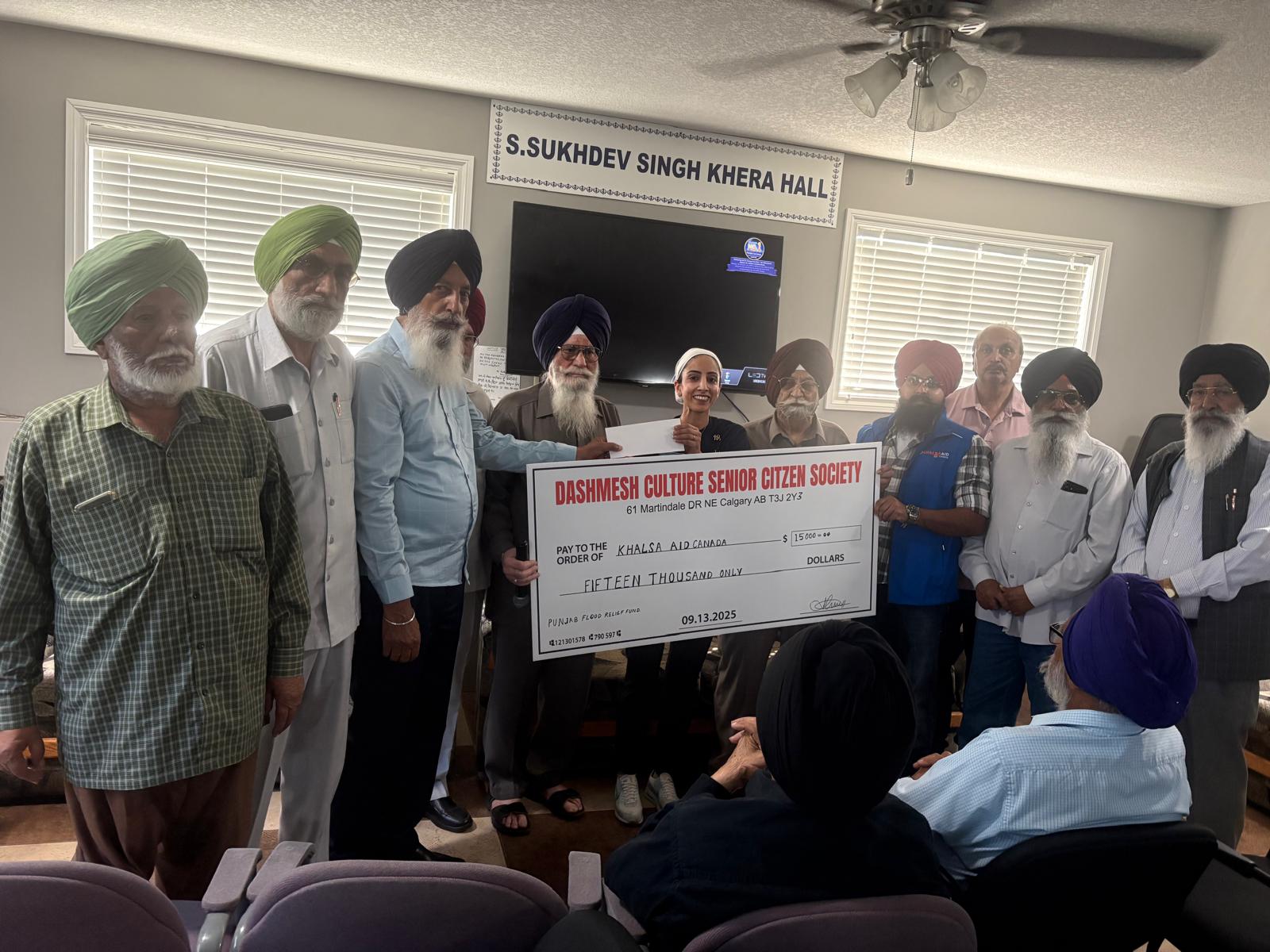 ਕੈਲਗਰੀ (ਪੰਜਾਬੀ ਅਖ਼ਬਾਰ ਬਿਊਰੋ) ਪੰਜਾਬ ਵਿੱਚ ਆਏ ਹੜ੍ਹਾਂ ਕਾਰਣ ਹੜ੍ਹ ਪੀੜਤ ਏਰੀਆ ਦੇ ਮੁੜ ਵਸੇਵੇ ਲਈ ਬਹੁਤ ਸਾਰੀਆਂ ਸਮਾਜ ਸੇਵੀ ਸੰਸਥਾਵਾਂ ਇਸ ਸੇਵਾ ਵਿੱਚ ਲੱਗੀਆਂ ਹੋਈਆਂ ਹਨ ਜਿਹਨਾਂ ਵਿੱਚੋਂ ਖਾਲਸਾ ਏਡ ਦਾ ਨਾਂ ਹਰ ਪੰਜਾਬੀ ਦੀ ਜ਼ੁਬਾਨ ਉੱਪਰ ਹੈ। ਖਾਲਸਾ ਏਡ ਦੇ ਹੁਣ ਤੱਕ ਦੇ ਕੀਤੇ ਮੱਦਦਗਾਰੀ ਕੰਮਾਂ ਨੂੰ ਦੇਖਦੇ ਹੋਏ ਕੈਲਗਰੀ ਵਿਖੇ ਬਜੁਰਗਾਂ ਦੀ ਸੰਸਥਾ ਦਸਮੇਸ਼ ਕਲਚਰਲ ਸੀਨੀਅਰ ਸਿਟੀਜਨ ਸੋਸਾਇਟੀ ਵੱਲੋਂ ਖਾਲਸਾ ਏਡ ਦੇ ਦੋ ਨੁਮਾਇੰਦਿਆਂ ਸ: ਅਜੀਤ ਸਿੰਘ ਅਤੇ ਉਪਨੀਤ ਕੌਰ ਨੂੰ ਆਪਣੇ ਮੈਂਬਰਾਂ ਦੀ ਹਾਜਿਰੀ ਵਿੱਚ 15000 ਕਨੇਡੀਅਨ ਡਾਲਰ ਦਾ ਚੈਕ ਹੜ੍ਹ ਪੀੜਤਾਂ ਦੀ ਮੱਦਦ ਲਈ ਭੇਟ ਕੀਤਾ ਗਿਆ ।