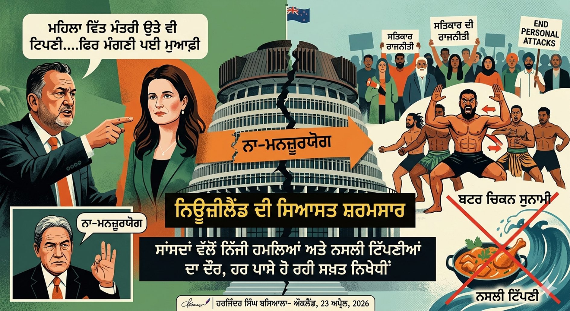 ਔਕਲੈਂਡ, 23 ਅਪ੍ਰੈਲ, 2026: –ਨਿਊਜ਼ੀਲੈਂਡ ਦੀ ਸਿਆਸਤ ਵਿੱਚ ਵਿਵਾਦਾਂ ਦਾ ਹੜ੍ਹ ਆਇਆ ਹੋਇਆ ਹੈ। ਚਾਰੇ ਪਾਸੇ ਨਿੱਜੀ ਟਿੱਪਣੀਆਂ ਅਤੇ ਨਸਲੀ ਵਿਤਕਰੇ ਦੀਆਂ ਘਟਨਾਵਾਂ ਦੀ ਸਖ਼ਤ ਨਿਖੇਧੀ ਹੋ ਰਹੀ ਹੈ। ਹਾਲ ਹੀ ਦੇ ਦਿਨਾਂ ਵਿੱਚ ਨਿਊਜ਼ੀਲੈਂਡ ਦੇ ਸਿਆਸੀ ਗਲਿਆਰਿਆਂ ਵਿੱਚ ਨਿੱਜੀ ਹਮਲਿਆਂ ਅਤੇ ਨਸਲੀ ਟਿੱਪਣੀਆਂ ਕਾਰਨ ਮਾਹੌਲ ਕਾਫੀ ਗਰਮਾ ਗਿਆ ਹੈ। ਡਿਪਟੀ ਲੀਡਰ ਸ਼ੇਨ ਜੋਨਸ ਵੱਲੋਂ ਵਿੱਤ ਮੰਤਰੀ ਨਿਕੋਲਾ ਵਿਲਿਸ ਬਾਰੇ ਕੀਤੀ ਗਈ ਨਿੱਜੀ ਟਿੱਪਣੀ ਅਤੇ ਹੋਰ ਮੈਂਬਰਾਂ ਨਾਲ ਹੋਏ ਨਸਲੀ ਵਿਤਕਰੇ ਨੇ ਦੇਸ਼ ਭਰ ਵਿੱਚ ਇੱਕ ਨਵੀਂ ਚਰਚਾ ਛੇੜ ਦਿੱਤੀ ਹੈ।