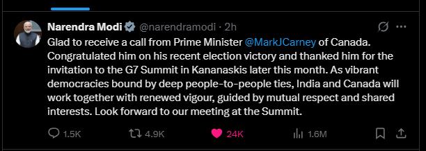 ਕੈਲਗਰੀ (ਪੰਜਾਬੀ ਅਖ਼ਬਾਰ ਬਿਊਰੋ) ਹੁਣ ਤੱਕ ਚੱਲ ਰਹੀਆਂ ਚਰਚਾਵਾਾਂ ਕਿ ਭਾਰਤ ਦੇ ਪ੍ਰਧਾਨ ਮੰਤਰੀ ਨਰਿੰਦਰ ਮੋਦੀ ਨੂੰ ਕਨੇਡਾ ਵੱਲੋਂ ਜੀ -7 ਲਈ ਸੱਦਾ ਮਿਲਦਾ ਹੈ ਕਿ ਨਹੀਂ ਮਿਲਦਾ ,ਨੂੰ ਉਸ ਵੇਲੇ ਠੱਲ ਪੈ ਗਈ ਜਦੋਂ ਨਰਿੰਦਰ ਮੋਦੀ ਨੇ ਆਪਣੇ ਐਕਣ ਸੋਸ਼ਲ ਮੀਡੀਆ ਉੱਪਰ ਕਨੇਡਾ ਦੇ ਪ੍ਰਧਾਨ ਮੰਤਰੀ ਮਾਰਕ ਕਾਰਨੀ ਵੱਲੋਂ ਸੱਦਾ ਮਿਲ ਜਾਣ ਦੀ ਪੁਸ਼ਟੀ ਕਰ ਦਿੱਤੀ ਹੈ। ਇਸ ਸਬੰਧੀ ਉਹਨਾਂ ਲਿਖਿਆ ਹੈ ਕਿ ਕੈਨੇਡਾ ਦੇ ਪ੍ਰਧਾਨ ਮੰਤਰੀ ਮਾਰਕ ਕਾਰਨੀ ਦਾ ਫ਼ੋਨ ਪ੍ਰਾਪਤ ਕਰਕੇ ਖੁਸ਼ੀ ਹੋਈ। ਉਨ੍ਹਾਂ ਨੂੰ ਉਨ੍ਹਾਂ ਦੀ ਹਾਲੀਆ ਚੋਣ ਜਿੱਤ ‘ਤੇ ਵਧਾਈਆਂ ਅਤੇ ਇਸ ਮਹੀਨੇ ਦੇ ਅੰਤ ਵਿੱਚ ਕੈਨਾਨਾਸਕਿਸ ਵਿੱਚ ਹੋਣ ਵਾਲੇ ਜੀ-7 ਸੰਮੇਲਨ ਲਈ ਸੱਦਾ ਦੇਣ ਲਈ ਧੰਨਵਾਦ ਕੀਤਾ। ਡੂੰਘੇ ਲੋਕਾਂ-ਤੋਂ-ਲੋਕ ਸਬੰਧਾਂ ਨਾਲ ਬੱਝੇ ਜੀਵੰਤ ਲੋਕਤੰਤਰਾਂ ਦੇ ਰੂਪ ਵਿੱਚ, ਭਾਰਤ ਅਤੇ ਕੈਨੇਡਾ ਆਪਸੀ ਸਤਿਕਾਰ ਅਤੇ ਸਾਂਝੇ ਹਿੱਤਾਂ ਦੁਆਰਾ ਨਿਰਦੇਸ਼ਤ, ਨਵੇਂ ਜੋਸ਼ ਨਾਲ ਮਿਲ ਕੇ ਕੰਮ ਕਰਨਗੇ। ਸੰਮੇਲਨ ਵਿੱਚ ਸਾਡੀ ਮੁਲਾਕਾਤ ਦੀ ਉਡੀਕ ਹੈ।