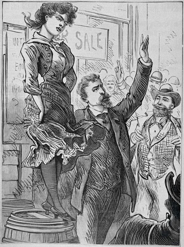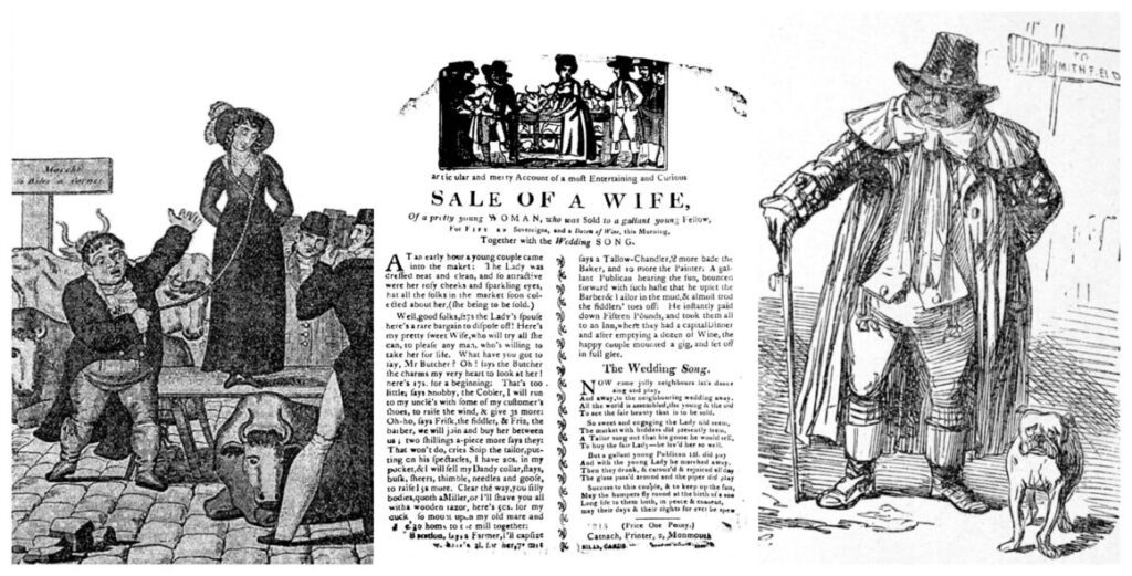 1832 ਵਿੱਚ ਜੋਸਫ਼ ਥੌਮਸਨ ਨਾਮੀ ਇੱਕ ਵਿਅਕਤੀ ਨੇ ਕਥਿਤ ਤੌਰ ‘ਤੇ ਆਪਣੀ ਪਤਨੀ ਨੂੰ ਵੇਚਣ ਵੇਲੇ ਉਸਦੇ ਮਾੜੇ ਗੁਣਾਂ ਨੂੰ ਸੂਚੀਬੱਧ ਕਰਦਿਆਂ ਆਪਣੇ ਖਰੀਦਦਾਰਾਂ ਨੂੰ ਸਲਾਹ ਦਿੱਤੀ ਸੀ, “ਤੁਸੀਂ “ਜੀਉਂਦੀ ਸੱਪਣੀ, ਪਾਗਲ ਕੁੱਤੀ, ਗਰਜਦੀ ਸ਼ੇਰਨੀ, ਭਰਿਆ ਹੋਇਆ ਪਿਸਤੌਲ, ਹੈਜ਼ਾ ਵਰਗੀਆਂ ਬਿਮਾਰੀਆਂ ਯਾਨੀ ਮੇਰੀ ਪਤਨੀ ਤੋਂ ਬਚ ਸਕਦੇ ਹੋ ਤਾਂ ਬਚ ਜਾਉ। ” ਫਿਰ ਉਸਨੇ ਉਸਦੇ ਗੁਣਾਂ ਦਾ ਵਰਣਨ ਵੀ ਕੀਤਾ ਸੀ। ਜਿਸ ਵਿੱਚ ਗਾਵਾਂ ਦਾ ਦੁੱਧ ਚੋਣ, ਗਾਉਣ ਅਤੇ ਦਾਰੂ ਪੀਣ ਸਮੇਂ ਸਾਕੀ ਵਾਲੀ ਸੇਵਾ ਕਰਨ ਦੀ ਯੋਗਤਾ ਸ਼ਾਮਲ ਸੀ। ਇਸ ਲਈ, ਮੈਂ ਇੱਥੇ ਉਸ ਦੀਆਂ ਸਾਰੀਆਂ ਸੰਪੂਰਨਤਾਵਾਂ ਅਤੇ ਅਪੂਰਣਤਾਵਾਂ ਦੇ ਨਾਲ ਪੰਜ ਸ਼ਿਿਲੰਗਾਂ ਬਦਲੇ ਪੇਸ਼ ਕਰਦਾ ਹਾਂ।”