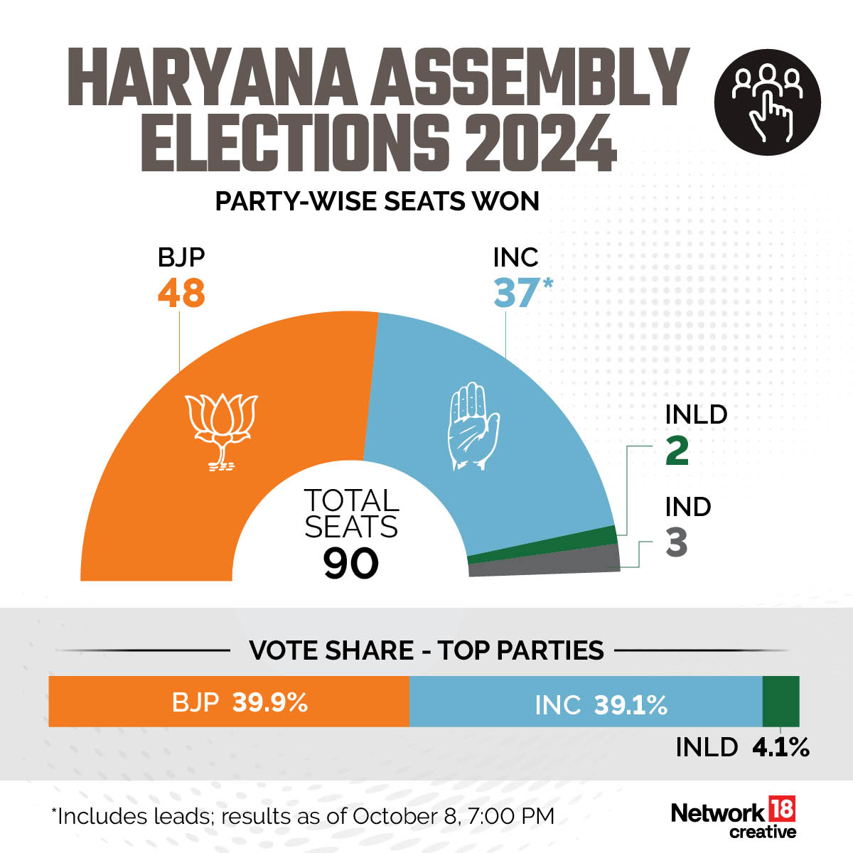 ਹਰਿਆਣਾ ਵਿਧਾਨ ਸਭਾ ਦੀਆਂ ਚੋਣਾਂ ਵਿੱਚ ਕਾਂਗਰਸ ਪਾਰਟੀ ਅਤੇ ਭਾਰਤੀ ਜਨਤਾ ਪਾਰਟੀ ਦੀ ਕਾਂਟੇ ਦੀ ਟੱਕਰ ਵਿੱਚ ਭਾਰਤੀ ਜਨਤਾ ਪਾਰਟੀ ਚੋਣ ਜਿੱਤ ਗਈ ਹੈ। ਗਿਣਤੀ ਸ਼ੁਰੂ ਹੋਣ ਤੋਂ ਸਵੇਰੇ 9.30 ਵਜੇ ਤੱਕ ਕਾਂਗਰਸ ਪਾਰਟੀ ਦੇ ਪੱਖ ਵਿੱਚ ਝੁਕਾਆ ਆ ਰਹੇ ਸਨ ਪ੍ਰੰਤੂ 9.40 ਮਿੰਟ ਝੁਕਾਆ ਬਦਲ ਕੇ ਭਾਰਤੀ ਜਨਤਾ ਪਾਰਟੀ ਦੇ ਹੱਕ ਵਿੱਚ ਆਉਣੇ ਸ਼ੁਰੂ ਹੋ ਗਏ ਜੋ ਅਖ਼ੀਰ ਤੱਕ ਭਾਰਤੀ ਜਨਤਾ ਦੇ ਹੱਕ ਵਿੱਚ ਬਰਕਰਾਰ ਰਹੇ। ਲੋਕ ਸਭਾ ਦੀ ਚੋਣ ਦੀ ਤਰ੍ਹਾਂ ਇਸ ਵਾਰ ਪ੍ਰਧਾਾਨ ਮੰਤਰੀ ਨਰਿੰਦਰ ਮੋਦੀ ਦੇ ਨਾਮ ‘ਤੇ ਵੋਟਾਂ ਨਹੀਂ ਮੰਗੀਆਂ ਗਈਆਂ। ਆਰ ਐਸ ਐਸ ਨੇ ਪਾਰਟੀ ਦੇ ਨਾਮ ‘ਤੇ ਵੋਟਾਂ ਮੰਗਣ ਲਈ ਜ਼ੋਰ ਪਾਇਆ ਸੀ। ਭਾਰਤੀ ਜਨਤਾ ਪਾਰਟੀ ਹਰਿਆਣਾ ਵਿੱਚ ਲਗਾਤਾਰ ਤੀਜੀ ਵਾਰ ਸਰਕਾਰ ਬਣਾਉਣ ਜਾ ਰਹੀ ਹੈ। ਮਈ 2024 ਦੀਆਂ ਲੋਕ ਸਭਾ ਦੀਆਂ ਚੋਣਾਂ ਵਿੱਚ ਭਾਰਤੀ ਜਨਤਾ ਪਾਰਟੀ ਨੇ ਹਰਿਆਣਾ ਦੀਆਂ 10 ਲੋਕ ਸਭਾ ਸੀਟਾਂ ਵਿੱਚੋਂ 5 ਸੀਟਾਂ ਜਿੱਤੀਆਂ ਸਨ। ਭਾਰਤੀ ਜਨਤਾ ਪਾਰਟੀ ਅਤੇ ਕਾਂਗਰਸ ਨੇ 5-5 ਸੀਟਾਂ ਜਿੱਤੀਆਂ ਸਨ, ਜਿਸ ਤੋਂ ਭਾਰਤੀ ਜਨਤਾ ਪਾਰਟੀ ਦੀ ਗਿਰਾਵਟ ਦਾ ਪਤਾ ਚਲਦਾ ਸੀ। ਪ੍ਰੰਤੂ ਤੀਜੀ ਵੀਰ ਵੀ ਭਾਰਤੀ ਜਨਤਾ ਪਾਰਟੀ ਡਬਲ ਇੰਜਣ ਵਾਲੀ ਸਰਕਾਰ ਬਣਾਉਣ ਵਿੱਚ ਸਫਲ ਹੋ ਗਈ। ਭਾਰਤੀ ਜਨਤਾ ਪਾਰਟੀ ਭਾਵੇਂ ਚੋਣਾਂ ਜਿੱਤ ਗਈ ਹੈ ਪ੍ਰੰਤੂ ਉਨ੍ਹਾਂ ਨੂੰ ਉਦੋਂ ਨਮੋਸ਼ੀ ਦਾ ਸਾਹਮਣਾ ਕਰਨਾ ਪਿਆ ਜਦੋਂ ਮੁੱਖ ਮੰਤਰੀ ਨਾਇਬ ਸਿੰਘ ਸੈਣੀ ਦੀ ਸਰਕਾਰ ਦੇ 8 ਮੰਤਰੀ ਚੋਣ ਹਾਰ ਗਏ ਹਨ, ਜਿਨ੍ਹਾਂ ਵਿੱਚ ਵਿਧਾਨ ਸਭਾ ਦੇ ਸਾਬਕਾ ਸਪੀਕਰ ਨਾਇਬ ਚੰਦ ਵੀ ਸ਼ਾਮਲ ਹਨ। ਚੋਣ ਹਾਰਨ ਵਾਲੇ ਮੰਤਰੀਆਂ ਵਿੱਚ ਸੰਜੇ ਸਿੰਘ, ਕੰਵਰ ਪਾਲ ਗੁਜਰ, ਡਾ.ਕੰਵਲ ਗੁਪਤਾ, ਸੁਭਾਸ਼ ਸੁਧਾ ਅਤੇ ਰਣਜੀਤ ਸਿੰਘ ਚੌਟਾਲਾ ਸ਼ਾਮਲ ਹਨ। ਕਾਂਗਰਸ ਪਾਰਟੀ ਨੂੰ ਜ਼ਬਰਦਸਤ ਝਟਕਾ ਲੱਗਿਆ ਹੈ ਕਿਉਂਕਿ ਉਹ ਤਾਂ ਆਪਣੀ ਜਿੱਤ ਪੱਕੀ ਸਮਝੀ ਬੈਠੇ ਸਨ। ਦਸ ਸਾਲ ਦੇ ਸਨਿਆਸ ਤੋਂ ਬਾਅਦ ਕਾਂਗਰਸੀ ਆਸ ਦੀ ਕਿਰਨ ਜਗਾਈ ਬੈਠੇ ਸਨ ਪ੍ਰੰਤੂ ਕਾਂਗਰਸ ਦੀ ਧੜੇਬੰਦੀ ਤੇ ਆਪਸੀ ਲੜਾਈ ਉਸ ਦੀਆਂ ਜੜ੍ਹਾਂ ਵਿੱਚ ਬੈਠ ਗਈ। ਕੁਲ ਪੋਲ ਹੋਈਆਂ 67.90 ਫ਼ੀ ਸਦੀ ਵੋਟਾਂ ਵਿੱਚੋਂ ਕਾਂਗਰਸ ਨੂੰ 39.38 ਫ਼ੀ ਸਦੀ ਤੇ ਭਾਰਤੀ ਜਨਤਾ ਪਾਰਟੀ ਨੂੰ 39.84 ਫ਼ੀ ਸਦੀ ਵੋਟਾਂ ਪ੍ਰਾਪਤ ਕੀਤੀਆਂ ਹਨ। 90 ਮੈਂਬਰੀ ਵਿਧਾਨ ਸਭਾ ਵਿੱਚੋਂ ਭਾਰਤੀ ਜਨਤਾ ਪਾਰਟੀ ਨੂੰ 51, ਕਾਂਗਰਸ ਪਾਰਟੀ ਨੂੰ 34, ਇਨੈਲੋ ਨੂੰ 2, 1 ਹਰਿਆਣਾਂ ਲੋਕ ਹਿਤ ਪਾਰਟੀ, ਇੱਕ ਬੀ ਐਸ ਪੀ.ਅਤੇ 2 ਆਜ਼ਾਦ ਉਮੀਦਵਾਰ ਚੋਣ ਜਿੱਤੇ ਹਨ। ਭਾਰਤੀ ਜਨਤਾ ਪਾਰਟੀ, ਕਾਂਗਰਸ, ਇਨੈਲੋ ਬੀ.ਐਸ.ਪੀ ਗਠਜੋੜ, ਆਮ ਆਦਮੀ ਪਾਰਟੀ, ਜੇ.ਪੀ.ਪੀ ਤੇ ਆਜ਼ਾਦ ਸਮਾਜ ਗੱਠਜੋੜ ਚੋਣਾ ਲੜੇ ਸਨ। ਕੁਲ 1031 ਉਮੀਦਵਾਰਾਂ ਨੇ ਚੋਣ ਲੜੀ ਸੀ, ਜਿਨ੍ਹਾਂ ਵਿੱਚ 101 ਔਰਤਾਂ, 464 ਆਜ਼ਾਦ ਉਮੀਦਵਾਰ ਸਨ। ਭਾਰਤੀ ਜਨਤਾ ਪਾਰਟੀ ਅਤੇ ਕਾਂਗਰਸ ਦੋਵੇਂ 89-89 ਸੀਟਾਂ ‘ਤੇ ਚੋਣ ਲੜੇ ਸਨ। ਕਾਂਗਰਸ ਨੇ ਇੱਕ ਭਿਵਾਨੀ ਦੀ ਸੀਟ ਸੀ.ਪੀ.ਐਮ.ਲਈ ਛੱਡ ਦਿੱਤੀ ਸੀ। ਭਾਰਤੀ ਜਨਤਾ ਪਾਰਟੀ ਨੇ ਸਿਰਸਾ ਸੀਟ ਹਰਿਆਣਾ ਲੋਕ ਹਿਤ ਪਾਰਟੀ ਦੇ ਗੋਪਾਲ ਕਾਂਡਾ ਲਈ ਛੱਡੀ ਸੀ। ਗੋਪਾਲ ਕਾਂਡਾ ਚੋਣ ਜਿੱਤ ਗਏ ਹਨ। ਇਨੈਲੋ ਅਤੇ ਬੀ.ਐਸ.ਪੀ. ਦੇ ਗਠਜੋੜ ਨੇ ਵੀ 89 ਸੀਟਾਂ ਤੋਂ ਚੋਣ ਲੜੀ ਸੀ, ਜਿਨ੍ਹਾਂ ਵਿੱਚੋਂ 51 ਸੀਟਾਂ ਤੇ ਇਨੈਲੋ ਨੇ ਉਮੀਦਵਾਰ ਖੜ੍ਹੇ ਕੀਤੇ ਸਨ। 2014 ਵਿੱਚ ਭਾਰਤੀ ਜਨਤਾ ਪਾਰਟੀ ਨੇ 90 ਵਿੱਚੋਂ 47 ਸੀਟਾਂ ਜਿੱਤਕੇ ਪੂਰਨ ਬਹੁਮਤ ਪ੍ਰਾਪਤ ਕੀਤਾ ਸੀ। ਉਦੋਂ 68.1 ਫ਼ੀ ਸਦੀ ਵੋਟਾਂ ਪੋਲ ਹੋਈਆਂ ਸਨ। 2019 ਵਿੱਚ ਭਾਰਤੀ ਜਨਤਾ ਪਾਰਟੀ ਨੇ 40 ਜਿੱਤੀਆਂ ਸਨ ਜੋ ਪੂਰਨ ਬਹੁਮਤ ਤੋਂ 6 ਸੀਟਾਂ ਘੱਟ ਸਨ ਤੇ 36.49 ਫ਼ੀ ਸਦ
