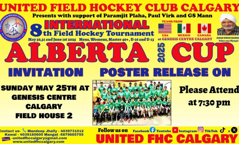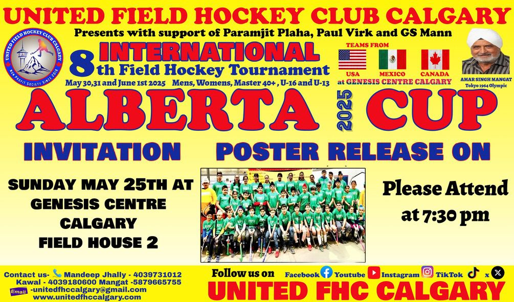 ਕੈਲਗਰੀ(ਪੰਜਾਬੀ ਅਖ਼ਬਾਰ ਬਿਊਰੋ) ਯੂਨਾਈਟਿਡ ਫੀਲਡ ਹਾਕੀ ਕਲੱਬ ਕੈਲਗਰੀ ਵੱਲੋਂ 8 ਵੇ ਅੰਤਰਰਾਸ਼ਟਰੀ ਫੀਲਡ ਹਾਕੀ ਟੂਰਨਾਮੈਂਟ ਜੋ ਕੇ 30,31 ਮਈ ਅਤੇ 1 ਜੂਨ ਨੂੰ ਜੈਨਸਿਸ ਸੈਂਟਰ ਵਿੱਚ ਐਲਬਰਟਾ ਕੱਪ 2025 ਦੇ ਨਾਮ ਹੇਠ ਆਯੋਜਿਤ ਕੀਤਾ ਜਾਵੇਗਾ ਦਾ ਪੋਸਟਰ ਰਿਲੀਜ ਅਤੇ ਮੀਡੀਆ ਬ੍ਰੀਫਿੰਗ ਕੀਤਾ ਗਿਆ । ਇਸ ਟੂਰਨਾਮੈਂਟ ਵਿੱਚ ਹਿੱਸਾ ਲੈਣ ਵਾਲੀਆਂ ਕੁੱਲ 30 ਟੀਮਾਂ ਬਾਰੇ ਜਾਣਕਾਰੀ ਵੀ ਸਾਂਝੀ ਕਰਦੇ ਹੋਏ ਮੁੱਖ ਪ੍ਰਬੰਧਕ ਮਨਦੀਪ ਝੱਲੀ ਨੇ ਦੱਸਿਆ ਕਿ ਇਹ ਕੈਲਗਰੀ ਵਿੱਚ ਪਹਿਲਾ ਅੰਤਰਰਾਸ਼ਟਰੀ ਟੂਰਨਾਮੈਂਟ ਹੈ, ਜਿਸ ਵਿੱਚ ਪੁਰਸ਼ਾਂ ਦੇ ਡਿਵੀਜ਼ਨ ਵਿੱਚ ਮੈਕਸੀਕੋ, ਅਮਰੀਕਾ ਅਤੇ ਪੂਰੇ ਕੈਨੇਡਾ ਦੀਆਂ ਟੀਮਾਂ ਭਾਗ ਲੈਣਗੀਆਂ। ਐਲਬਰਟਾ ਕੱਪ 2025 ਵਿੱਚ ਹਾਕੀ ਦੇ ਨਾਲ ਨਾਲ ਰੱਸਕਸੀ , ਤਾਸ਼ ਸੀਪ, ਗਿੱਧਾ ਭੰਗੜਾ,ਅੰਡਰ 10 ਰੇਸ ਵੀ ਹੋਵੇਗੀ।ਆਖ਼ਰੀ ਦਿਨ ਲੱਕੀ ਡਰਾਅ ਵਿੱਚ ਟੀ ਵੀ ਤੇ ਹੋਰ ਇਨਾਮ ਕੱਢੇ ਜਾਣਗੇ । ਟੂਰਨਾਮੈਂਟ ਸ਼ੁੱਕਰਵਾਰ ਸ਼ਾਮ 4 ਵਜੇ ਸ਼ੁਰੂ ਹੋਵੇਗਾ ਅਤੇ ਐਤਵਾਰ ਸ਼ਾਮ 6 ਵਜੇ ਸਮਾਪਤ ਹੋਵੇਗਾ ।ਅੱਜ ਪੋਸਟਰ ਸ਼ੇਅਰ ਕਰਨ ਸਮੇਂ ਹੈਪੀ ਮਾਨ ਪ੍ਰੀਮੀਅਰ ਦਫਤਰ ਤੋਂ ,ਗੁਰਿੰਦਰ ਬਰਾੜ ਐਨਡੀਪੀ MLA ,ਗੁਰਵਰਿਦਰ ਧਾਲੀਵਾਲ,ਰਣਬੀਰ ਪਰਮਾਰ ਸਾਬਕਾ ਪ੍ਰਧਾਨ ਗੁਰਦੁਆਰਾ ਦਸਮੇਸ਼ ਕਲਚਰ ਤੋਂ ਇਲਾਵਾ ਮਨਦੀਪ ਝੱਲੀ ,ਕੰਵਲ ਢਿੱਲੋਂ ਪ੍ਰਧਾਨ ,ਸੁਰਿੰਦਰ ਸਿੰਘ, ਮਨਵੀਰ ਗਿੱਲ, ਕੁਲਵੰਤ ਬਰਾੜ, ਮਨਵੀਰ ਮਾਂਗਟ, ਅਤੇ ਸਾਰੇ ਯੂਨਾਈਟਿਡ, ਫੀਲਡ ਹਾਕੀ ਕਲੱਬ ਦੇ ਖਿਡਾਰੀ , ਮਾਪੇ ਅਤੇ ਸਪਾਂਸਰ ਪਰਮੀਤ ਪਲਾਹਾ ਮੌਜੂਦ ਸਨ। ਮਨਦੀਪ ਝੱਲੀ ਨੇ ਕਲੱਬ ਬਾਰੇ ਜਾਣਕਾਰੀ ਸਾਂਝੀ ਕੀਤੀ ਕਿ 2024 ਵਿੱਚ ਇਸ ਕਲੱਬ ਵਿੱਚੋ 7 ਖਿਡਾਰੀ ਐਲਬਰਟਾ ਦੀ ਟੀਮ ਵਿੱਚ ਚੁਣੇ ਗਏ ਅਤੇ ਕਲੱਬ ਦੇ ਤਿੰਨ ਖਿਡਾਰੀਆਂ ਨੇ ਕਨੇਡਾ ਦੀ ਹਾਕੀ Under 17 ਟੀਮ ਦੀ ਨੁਮਾਇੰਦਗੀ ਕੀਤੀ । ਅਸੀਂ ਸਾਰੇ ਕੈਲਗਰੀ ਵਾਸੀਆਂ ਨੂੰ ਬੇਨਤੀ ਕਰਦੇ ਹਾਂ ਕਿ ਕਿਰਪਾ ਕਰਕੇ 30 ਮਈ ਤੋਂ 1 ਜੂਨ ਤੱਕ ਇਸ ਅੰਤਰਰਾਸ਼ਟਰੀ ਫੀਲਡ ਹਾਕੀ ਟੂਰਨਾਮੈਂਟ ਵਿੱਚ ਹਿੱਸਾ ਲਓ। ਇਹ ਕਲੱਬ ਪਿਛਲੇ 8 ਸਾਲਾਂ ਤੋਂ ਬੱਚਿਆਂ ਨੂੰ ਹਾਕੀ ਨਾਲ ਜੋੜਨ ਲਈ ਕੰਮ ਕਰ ਰਿਹਾ ਹੈ ਜਿਸ ਤਹਿਤ ਮੁਫਤ ਹਾਕੀ ਦੀ ਕੋਚਿੰਗ ਲਈ ਸੰਪਰਕ ਕਰੋ 4039731012.