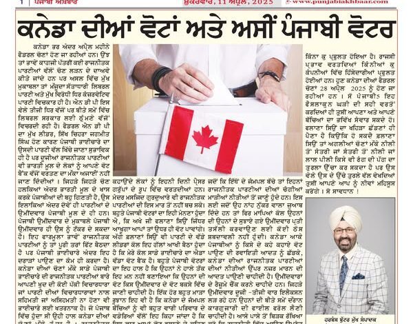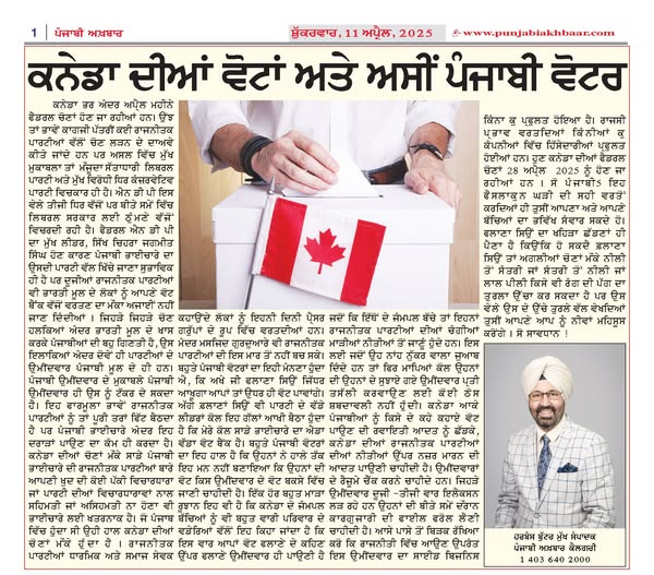 The federal elections are going to be held in April across Canada. Although many political parties claim to contest the elections on paper, in reality the main competition is between the current ruling Liberal Party and the main opposition Conservative Party. The NDP is currently a third party but has been a stumbling block for the Liberal government in the past. Since the main leader of the federal NDP is Jagmeet Singh, the Punjabi community is naturally drawn to his party, but other political parties also do not let the opportunity to use people of Indian origin as their vote bank go to waste. In those constituencies where there is a majority of people of Indian origin, especially Punjabis, the candidates of both parties are of Punjabi origin. Only a Punjabi candidate can compete with a Punjabi candidate. Although this formula suits the political parties perfectly, it only creates divisions within the Punjabi community. During the Canadian elections, the fact that our Punjabi community does not have a firm ideology of its own regarding the political parties or whether it agrees or disagrees with the party’s ideologies is also dangerous for the community. What used to happen in Punjab is the same situation that is happening during the Canadian elections. Political parties use people who are called religious and social workers as pressure groups these days. Temples, mosques and gurdwaras have also not been able to escape this attack of political parties. Most Punjabi voters believe that wherever so-and-so says, we will vote there. Even so-and-so keeps telling big party leaders that I have such a big vote bank from our community. The situation of most Punjabi voters is that they have not yet made up their minds as to which candidate their vote should go to. Another very bad trend is that children born in Canada are often told by their elders that this time they have to vote for such and such a candidate on the advice of so and so, whereas children born here are aware of the good and bad policies of these political parties. Therefore, when they give a flat answer, then the parents do not have any solid vocabulary to convince them about the candidate they have suggested. Punjabis who come to Canada should abandon the traditional habit of voting on someone’s advice and get into the habit of looking at the policies of the political parties in Canada. Candidates’ resumes should be checked. Candidates who are contesting elections for the second or third time should have their past performance files reviewed. Keep an eye on how much this candidate’s side business has flourished after entering politics. How many companies have been enriched by using political influence? Now the federal elections of Canada are going to be held on April 28, 2025. So Punjabio You can only improve your and your children’s future by using this decisive hour properly. You have to get rid of the shackles of such and such a person because it is possible that such and such a person can raise the hem of a turban of any color from blue to orange or orange to blue or red to yellow during the next elections, but at that time, looking at his high hem, you will feel low. So be careful! Harbans Buttar Editor-in-Chief